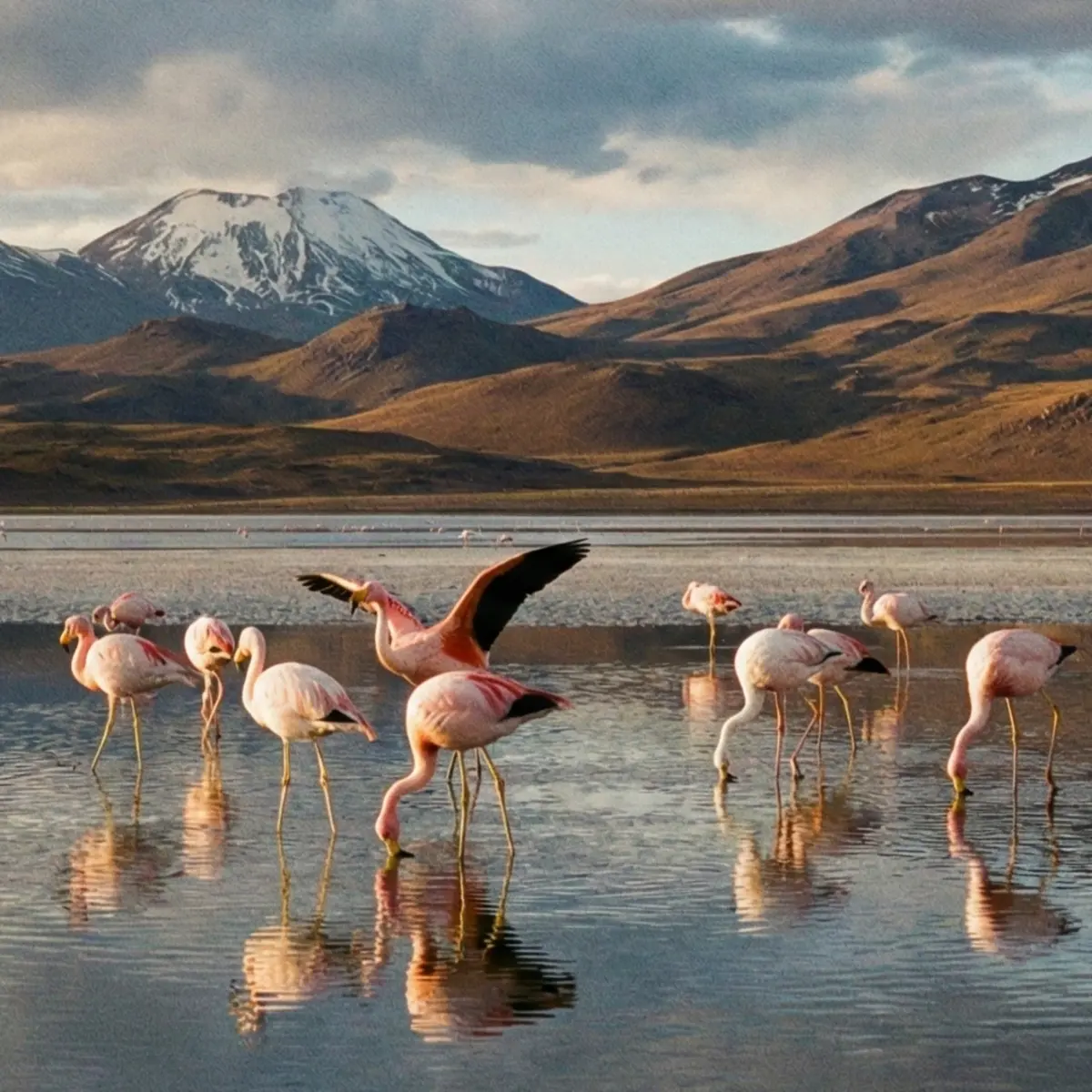 The lakes of the Altiplano are often hypersaline and caustic, environments that would be toxic to most life. The Andean Flamingo, however, has evolved to filter-feed on the microscopic algae and diatoms that bloom in these waters. Their distinct yellow legs and black-tipped wings set them apart from other species.